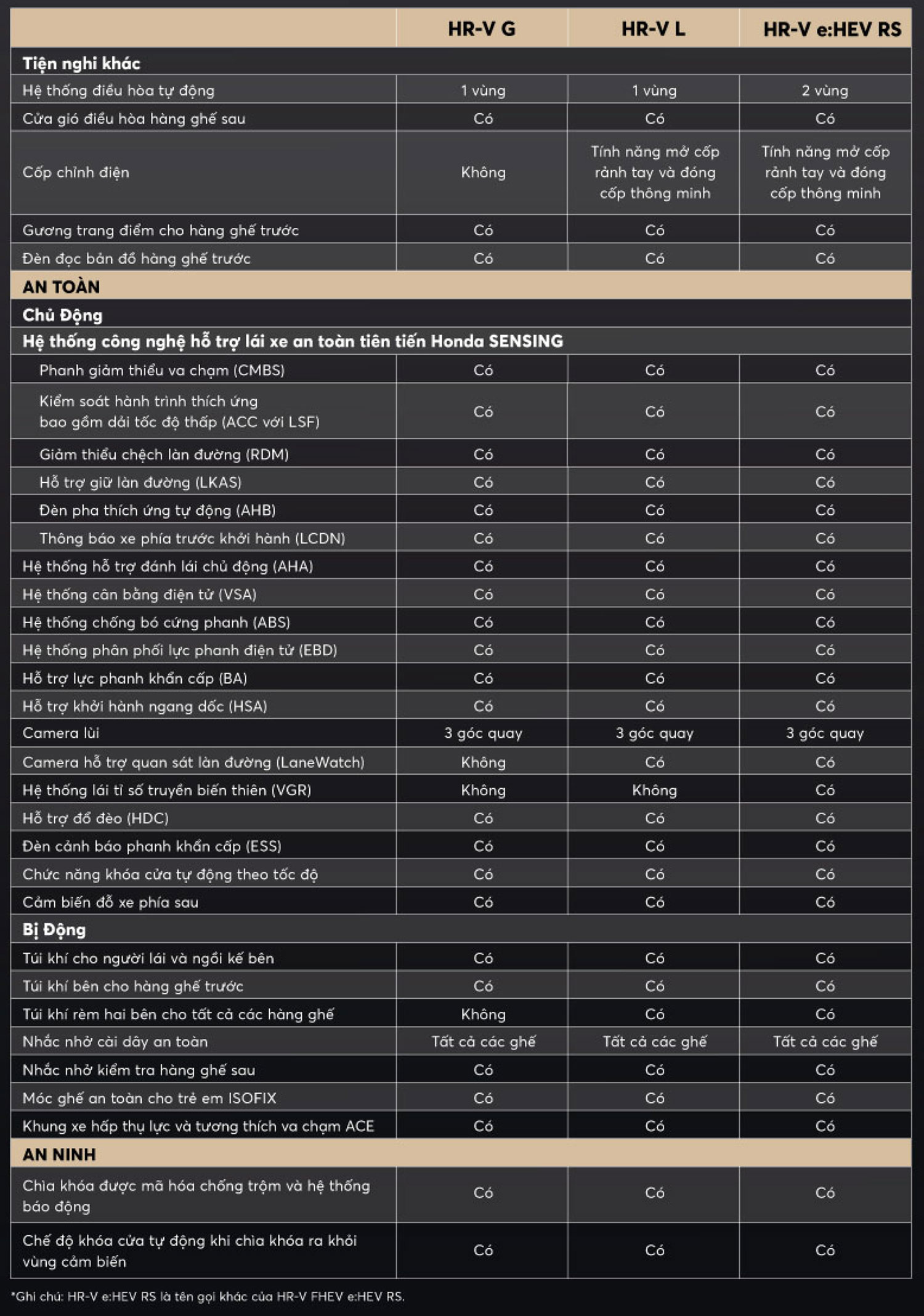 Tất cả các phiên bản của HR-V mới đều được trang bị Hệ thống công nghệ hỗ trợ lái xe an toàn tiên tiến Honda SENSING, bảo vệ toàn diện cho người lái, hành khách, người đi đường và các phương tiện xung quanh. Hệ thống bao gồm 6 tính năng ưu việt: